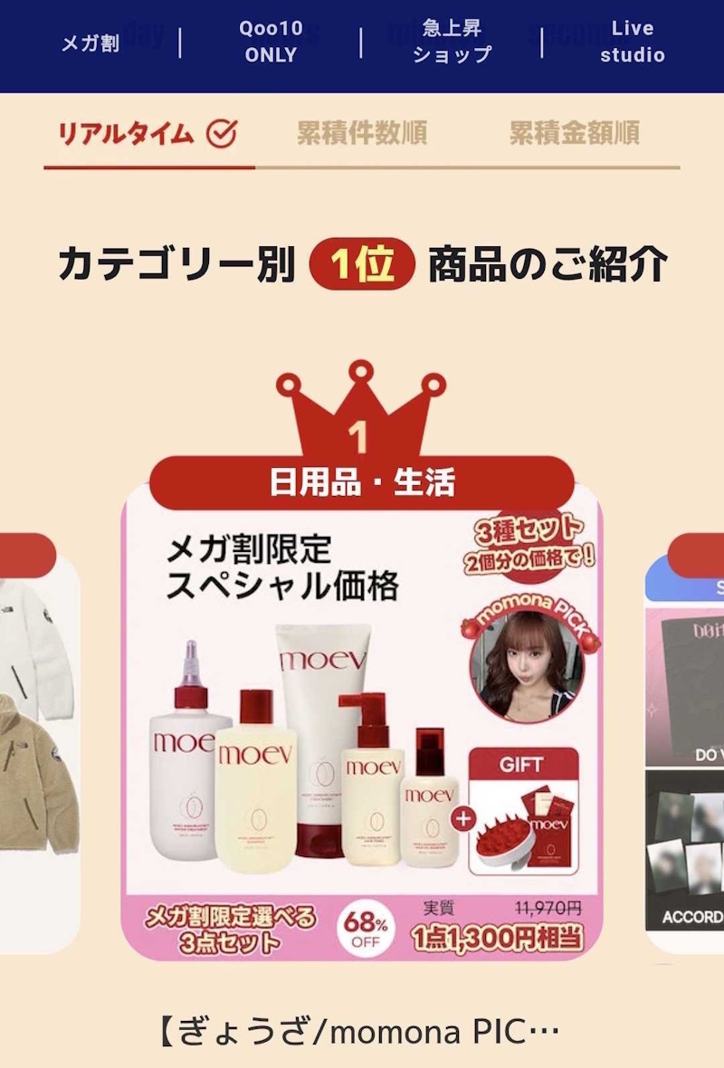 ヘアケアブランド「MOEV(モエブ)」が、日本最大のECプラットフォームQoo10が実施する大型セール「メガ割」において、ヘアケア部門1位を獲得した。